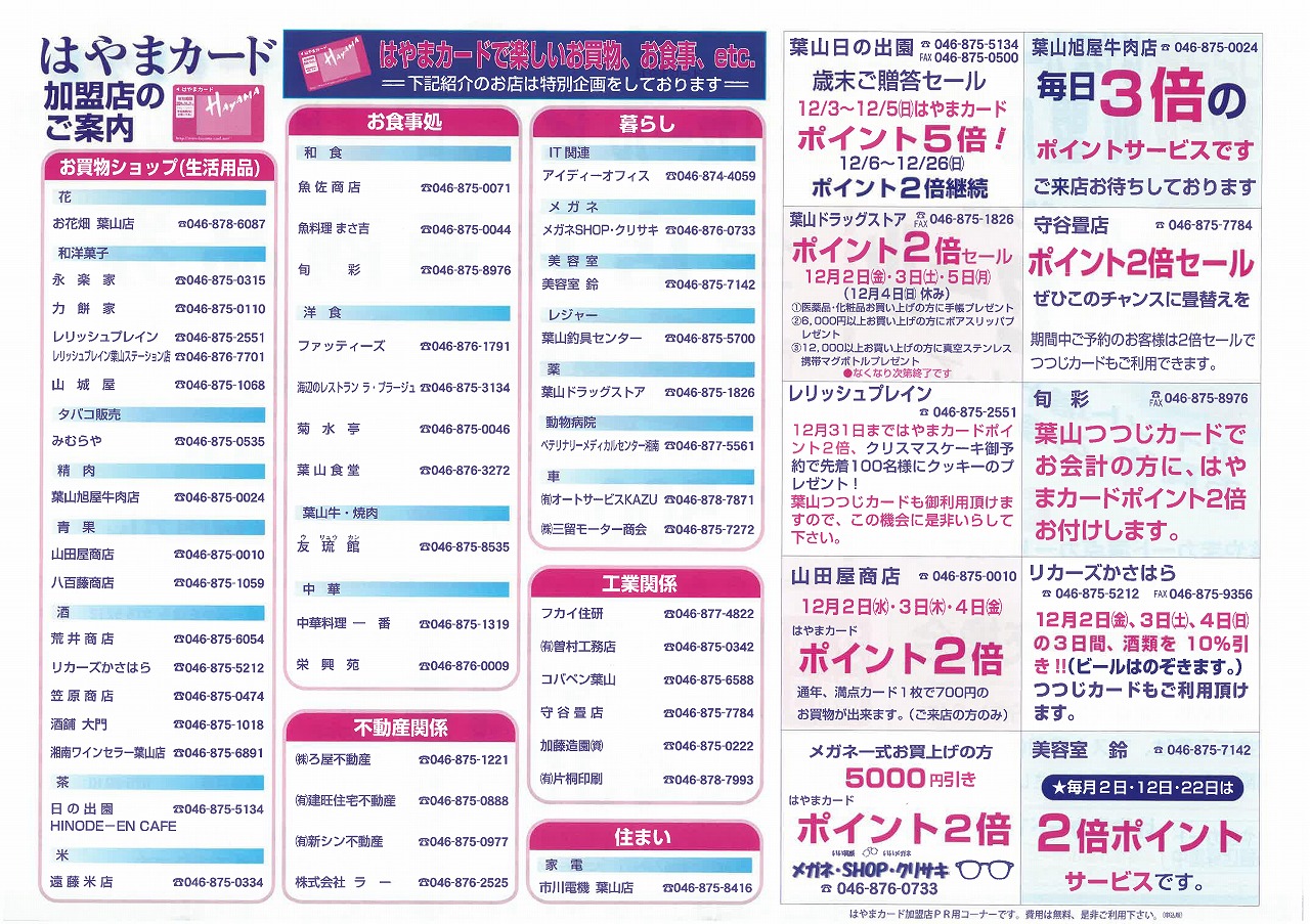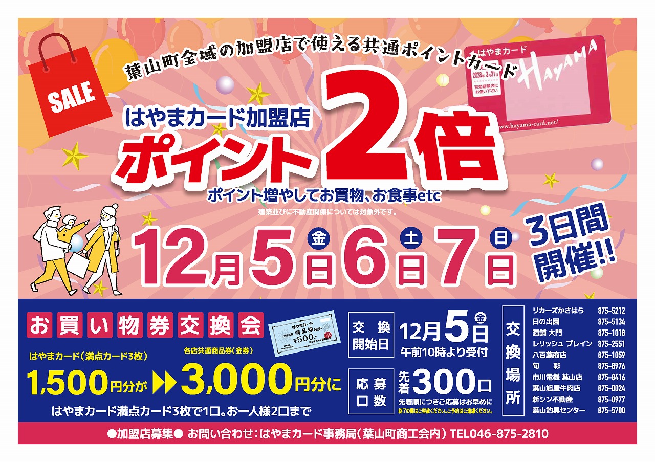 2022年歳末セールのお知らせ12月2,3,4日は「はやまカード」加盟店でお得にお買い物!恒例の満点カード3枚(通常1500円)が3000円分のはやまカード商品券に交換のチャンス!