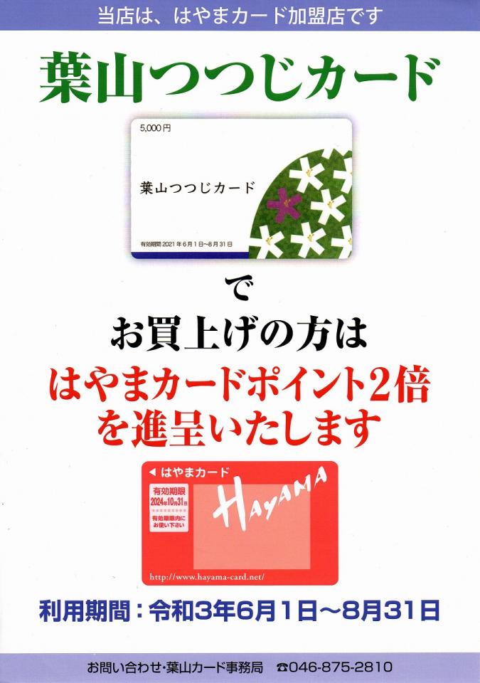お手元にお使いになっていらっしゃらない「つつじカード」はございませんか? つつじカードのご利用期限は8月31日です まだお使いになっていらっしゃらないカードをお持ちの方はぜひ 「葉山つつじカード」このポスターの貼ってある店舗でのご利用でポイント2倍お付けいたします。 是非この機会に葉山カード加盟店をご利用ください。